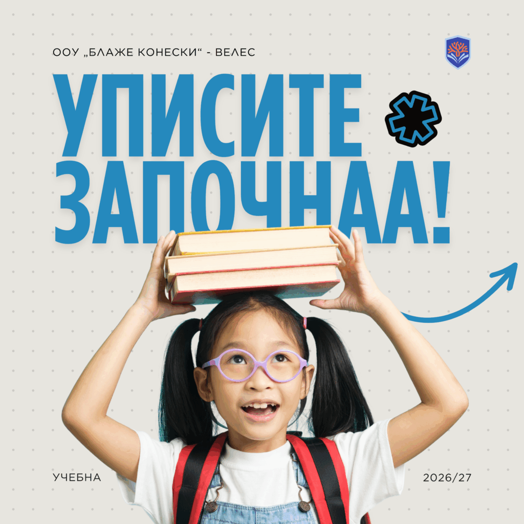 Општинското основно училиште „Блаже Конески“ – Велес Ве известува дека запишувањето на деца во I (прво) одделение ќе се врши во месец мај 2026 година, односно секој работен ден од 1 до 31 мај, во период од 8 до Read More …